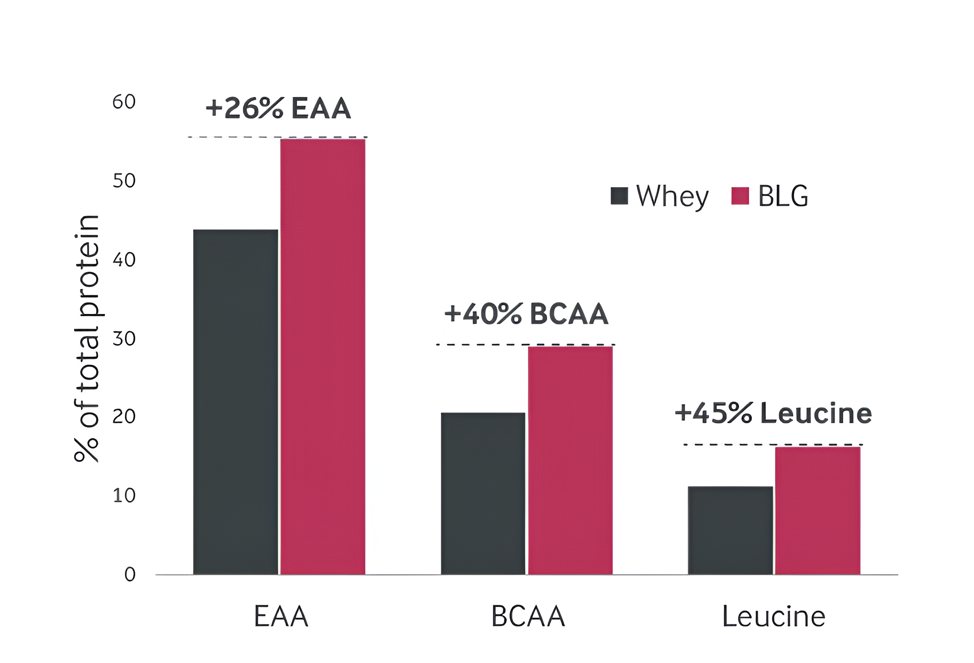 Los BCAA, que incluyen leucina, isoleucina y valina, son esenciales para la síntesis de proteínas musculares y la recuperación post-ejercicio. BLG-100 ofrece una concentración significativamente mayor de leucina en comparación con las proteínas de suero convencionales, optimizando el crecimiento y mantenimiento muscular.